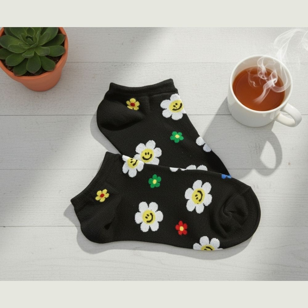 💐 商品特色 ・可愛笑臉小花設計,療癒指數爆表! ・柔軟棉料,親膚透氣不悶腳 ・襪口彈性佳,不滑落不勒腳 ・百搭短襪長度,鞋款配什麼都好看 ・日韓風穿搭必備小亮點🌸
