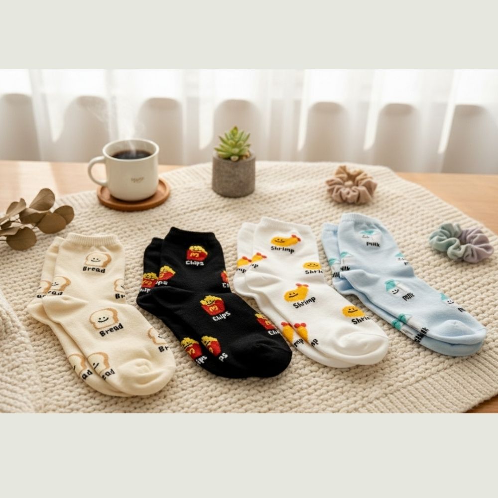 把可愛食物穿在腳上,一整天都好餓好療癒😋 麵包、薯條、蝦蝦、牛奶,每一款都萌到不行💛